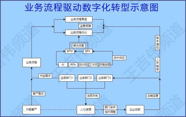 以业务流程驱动数字化转型,不需要搞什么战略架构,也不需要考虑组成层面,只看现在的业务流程是否存在简单重复的工作,能否实现业务流程优化,能不能通过流程自动化实现增效降本,能不能通过业务优化释放宝贵的人力资源,能不能让人力资源发挥更大的价值。